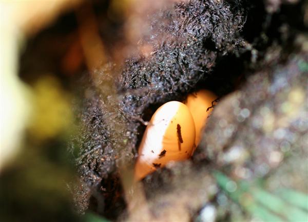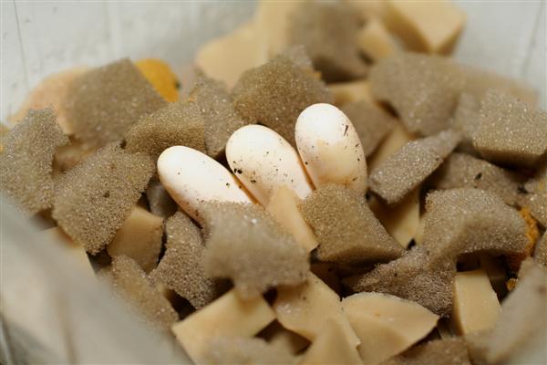 Ein perfekter Eiablageplatz wird zuverlässig immer wieder genutzt, z.B. der Wurzelballen eines epiphytischen Farns. Das erleichtert uns die Suche nach den Gelegen. Sie werden vorsichtig entnommen und in einer Heimchenbox mit kleinen Löchern im Boden in feuchte Schaumstoffflocken zu 2/3 eingebettet. In den Dosendeckel wird Fliegengaze eingesetzt.