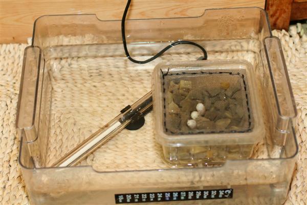 Nun wird die Box mit dem Gelege in einen Inkubator überführt. In diesem befindet sich im unteren Teil Wasser, welches mittels eines Aquarienheizstabs auf 28°C erwärmt wird.