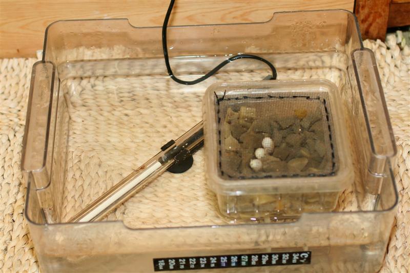 Direkt über der Wasseroberfläche wird die Box mit den Gelegen platziert, den Abschluß bildet noch ein Deckel an dem das verdunstete Wasser kondensiert, so dass nun die Luftfeuchte im Inkubator nahe 100% liegt und die Eier trotzdem nicht in der Nässe liegen.