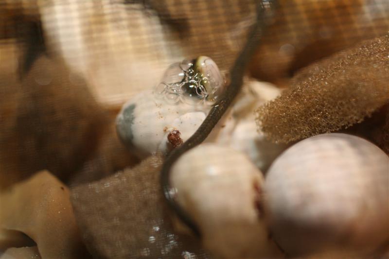 sind alle Jungtiere geschlüpft, wird die Dose in ein Aufzucht-Terrarium überführt, vorsichtig der Deckel mit der Fliegengaze entfernt, und wieder geduldig gewartet bis sich die Mini-Schlangen nach ca. einer Woche selbst aus der Schachtel herausbewegen um sich das erste Mal zu häuten. Bis dahin bleiben sie meist tief zwischen den noch feuchten Schaumstoffflocken vor neugierigen Blicken verborgen. Haben sie dann ihre erste Häutung hinter sich, kann man ihnen Nahrung in passender Größe anbieten. Das Nahrungsspektrum gleicht denen der Eltern, die Insekten müssen jedoch sehr viel kleiner sein. Wir fangen meist als erste Nahrung kleine Spinnen, es können aber auch gleich kleine Heimchen und Stabheuschrecken gereicht werden. Das Futter wird direkt ins Terrarium gegeben, die Tiere sollen ihren natürlichen Jagdtrieb ausleben.